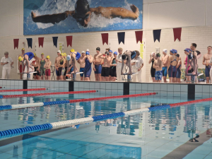 De wedstrijd werd spectaculair afgesloten met de 10x50m vrije slag gemengd alle leeftijden. Een drukke bedoening bij de start, maar wel heel erg leuk! Op het begin was het spannend tussen team 1 (baan 3) en team 2 (baan 4) van de Hof, maar team 1 wist toch weg te zwemmen en de winst te pakken. Team 2 eindigde als tweede. Op naar volgend seizoen!