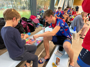 Tot slot de estafettes! Naomi, Danique, Britt en Evy begonnen de wedstrijd met 4x100 vrije slag, waarin Naomi meteen het goede voorbeeld gaf door een dik PR te zwemmen. De wedstrijd werd afgesloten met de 4x200m vrije slag heren en 4x100m vrije slag dames. Bij de heren zwommen in team 1 Gerdian, Thijmen (beiden net uit het water van hun vorige afstand), Pieter en Jacco, en in team 2 Leon, Robbin, Daan en Sven. Team 1 zwom naar de 2e plek, en team 2 naar de 5e. Bij de dames bestond team 1 uit Aukje, Mirte, Hannah en Yaell. Aukje begon goed in een PR, waarna de rest van de dames het afmaakten en de winst pakten. Team 2 met Iris Boswinkel, Noor, Linde en Deborah werden 4e. Applausje voor Leon en Linde die nipt in team 1 hadden kunnen starten (voor Leon scheelde het 0.20 seconden, Linde 0.03 seconden).
