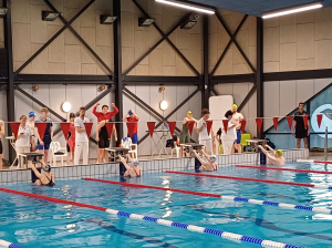 Tussendoor werd nog een 4x100m vrije slag junioren/jeugd gezwommen. Esmee, Robbin, Ann en Sven werden hierbij 2e. De wedstrijd werd afgesloten met een 4x100m wisselslag. Elisa Haverkate, Lionne, Finn en Jacco Nijland hebben gestreden, maar helaas is hun resultaat niet meegenomen in de einduitslag…